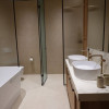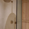 * Brushed bronze Hansgrohe faucets, heated wall in the bathroom, semi-freestanding bathtub