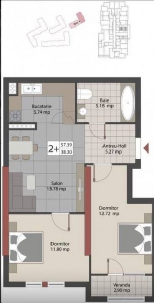 Acest apartament confortabil se află la etajul 8 din 18 și dispune de o suprafață de 55 metri pătrați.
