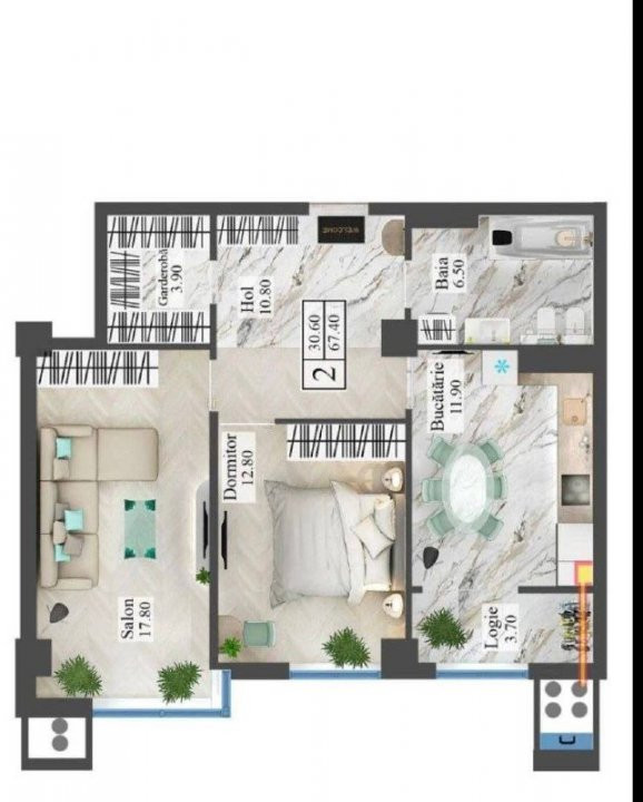 Compartimentare: hol, 2 dormitoare, bucătărie, bloc sanitar, logie, garderobă.