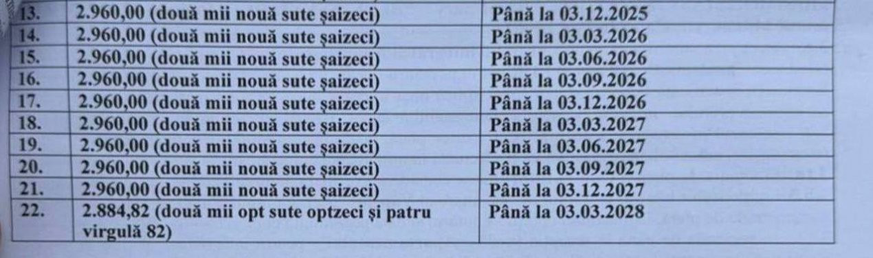 Posibilitatea achitării în rate suma de 29600 mii a cite 10 rate, trimestrial cate 2960 euro, urmatoarea rata 03.12.2025