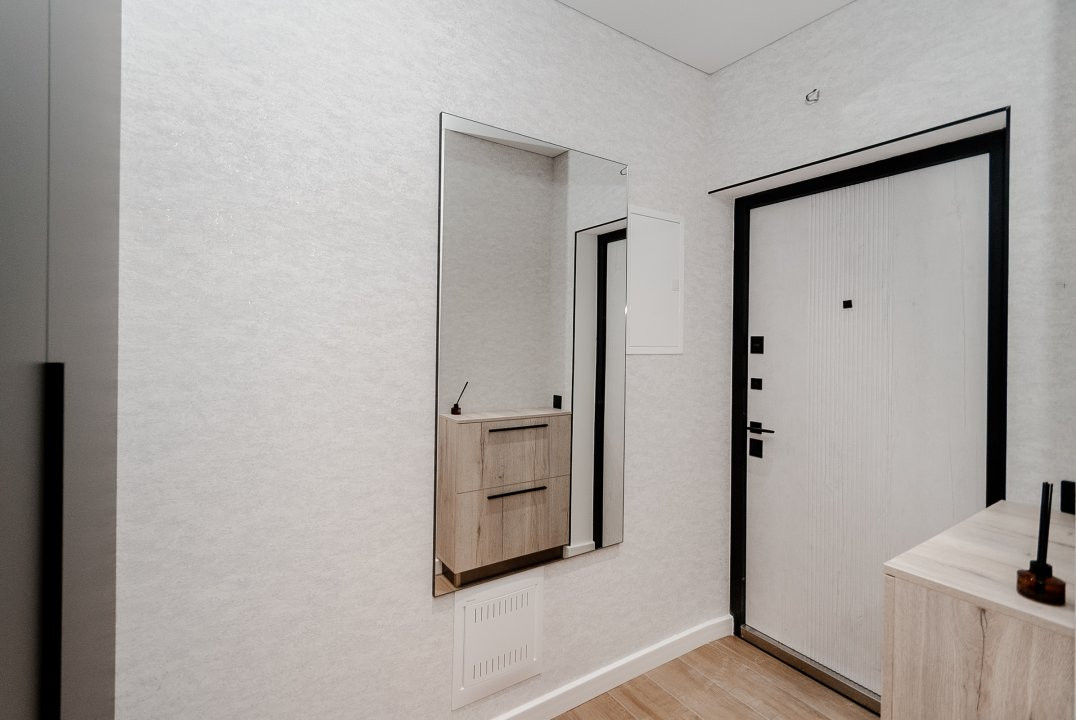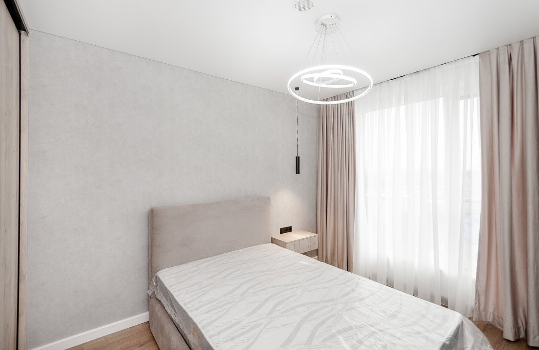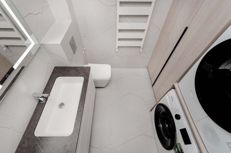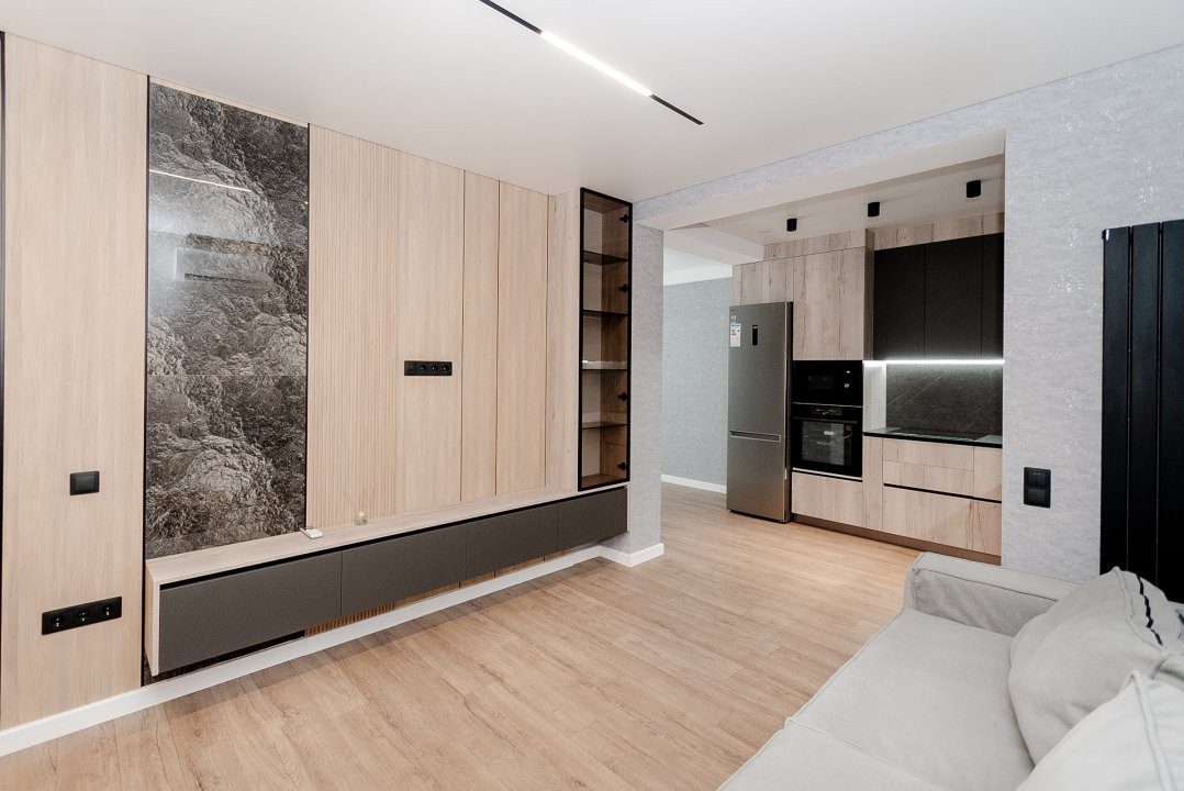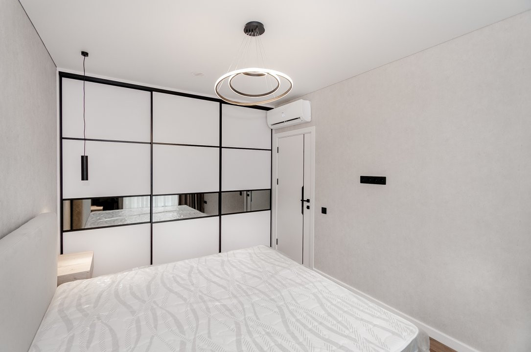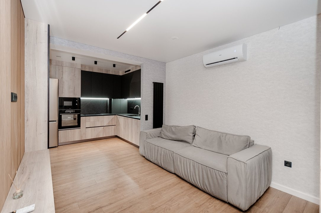 Mobilierul este ales într-o linie minimalistă, curată și coerentă: mobilier moale confortabil, dulapuri integrate și o bucătărie complet utilată, cu toată tehnica necesară, discret încadrată în design.
