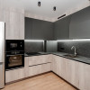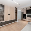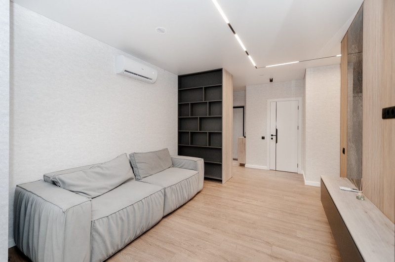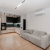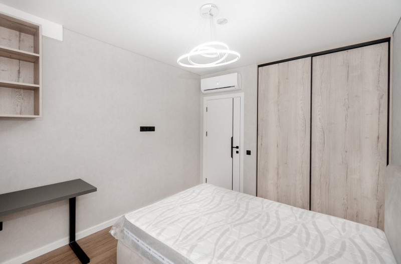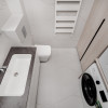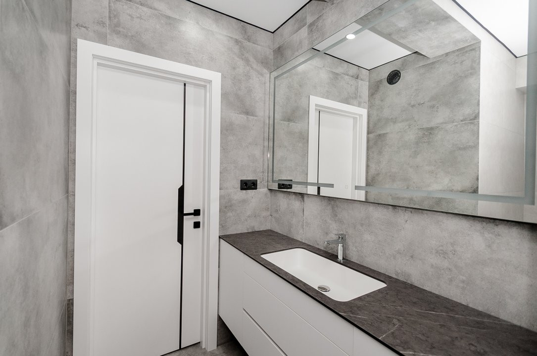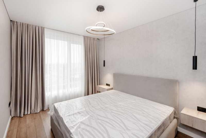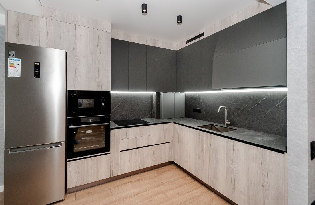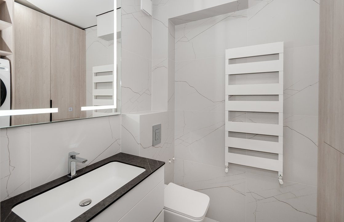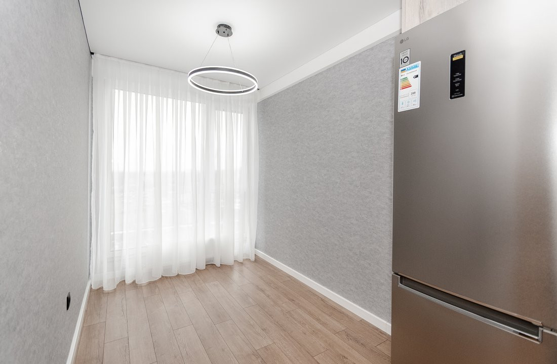 Mobilierul este ales într-o linie minimalistă, curată și coerentă: mobilier moale confortabil, dulapuri integrate și o bucătărie complet utilată, cu toată tehnica necesară, discret încadrată în design.