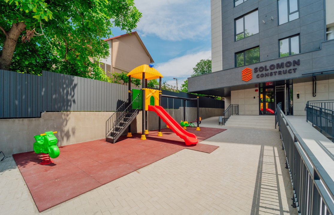 Curtea blocului este amenajată cu teren de joacă pentru copii, oferind un mediu liniștit și prietenos.