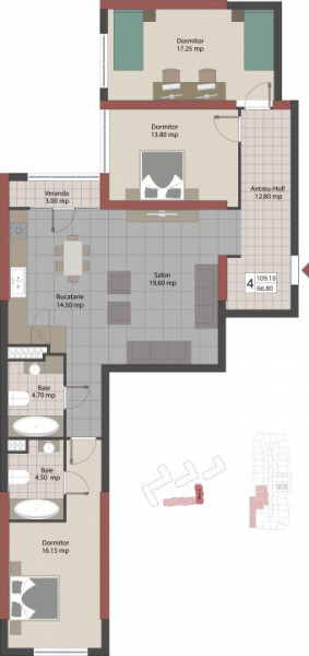 Acest apartament confortabil se află la etajul 12 din 18 și dispune de o suprafață de 109 metri pătrați.