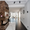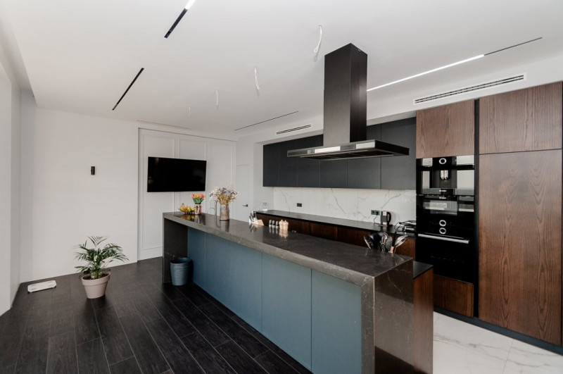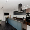 Mobilier de bucătărie MDF frezat și vopsit, blat HPL și tejghea din quartz;