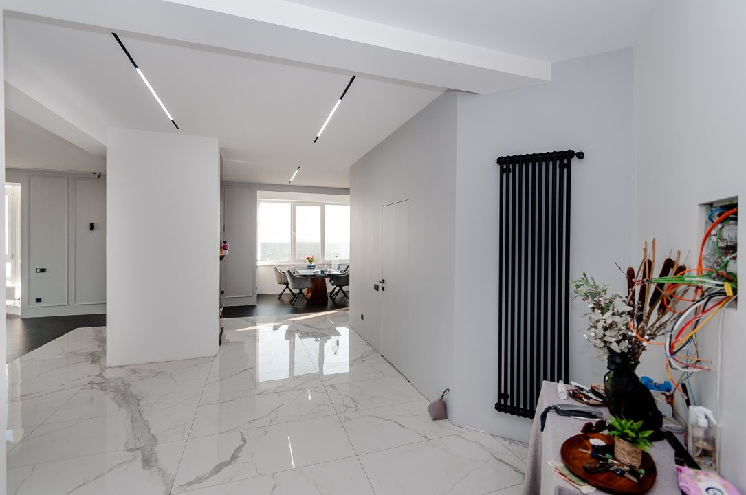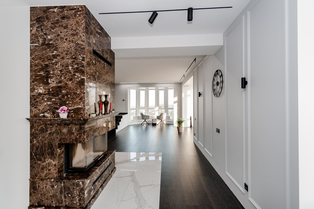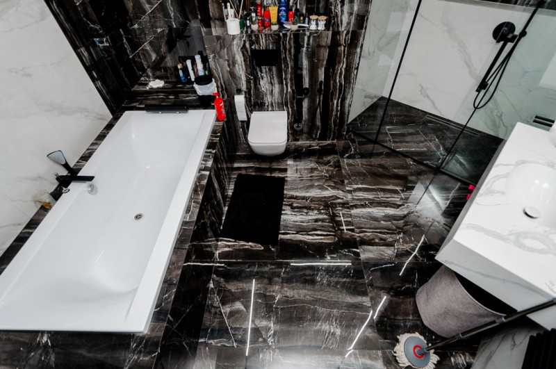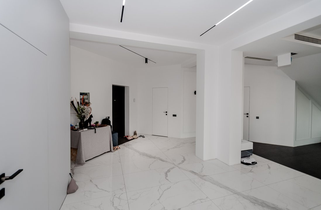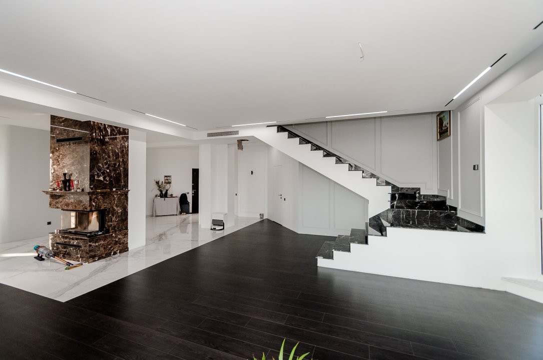 Pardoseli din porțelan spaniol, laminat german 12 mm, scări și pervazuri din marmură;