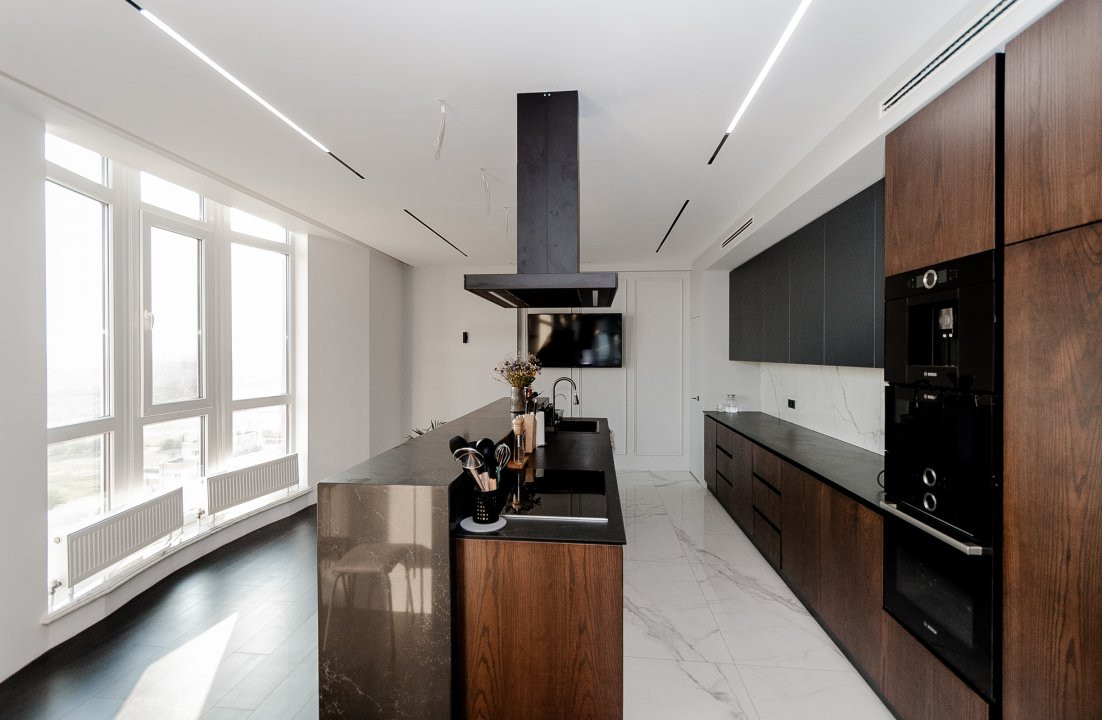 Sistem Smart Home (KNX) – control complet al iluminării, încălzirii, răcirii, perdelelor și alarmei de pe telefon (Apple Home / Google Home), cu opțiune de revenire la sistem clasic.