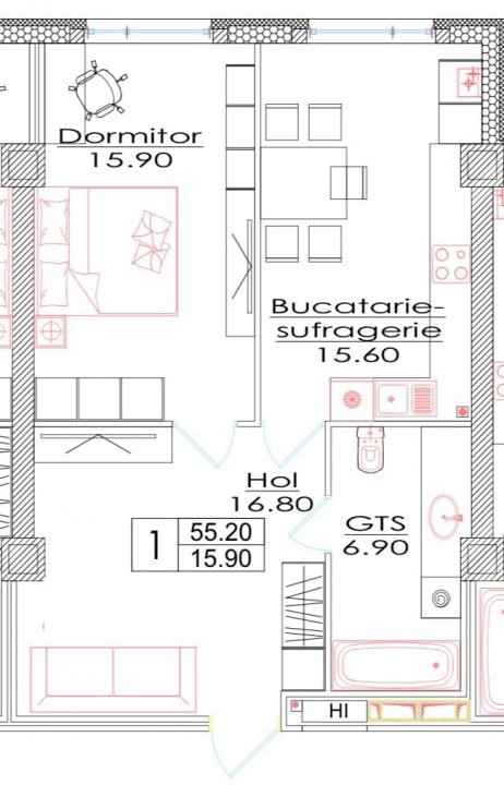 Compartimentare: 1 dormitor, bucătărie cu living, bloc sanitar, antreu.