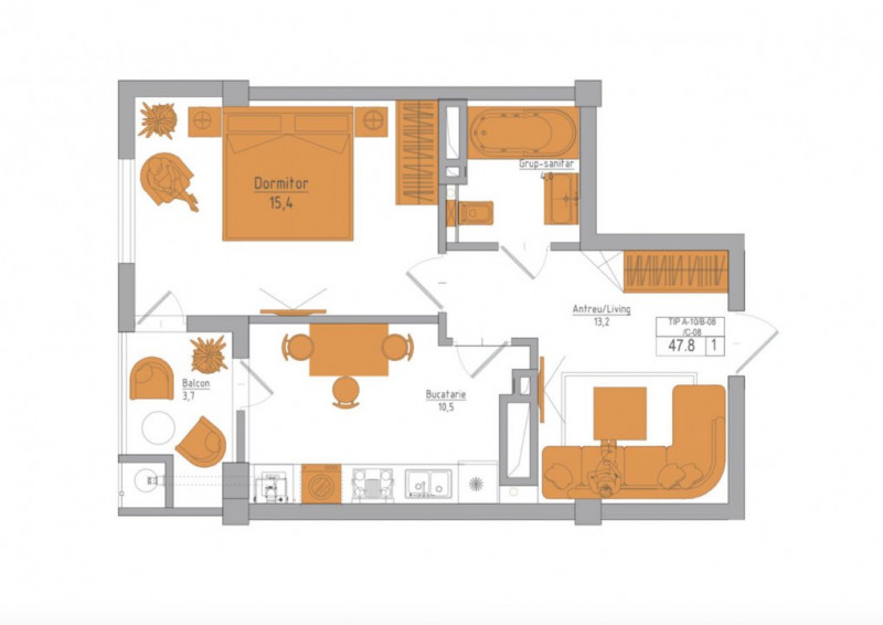 Suprafața totală: 47,8 mp (dormitor, living, bloc sanitar, bucătărie, balcon)