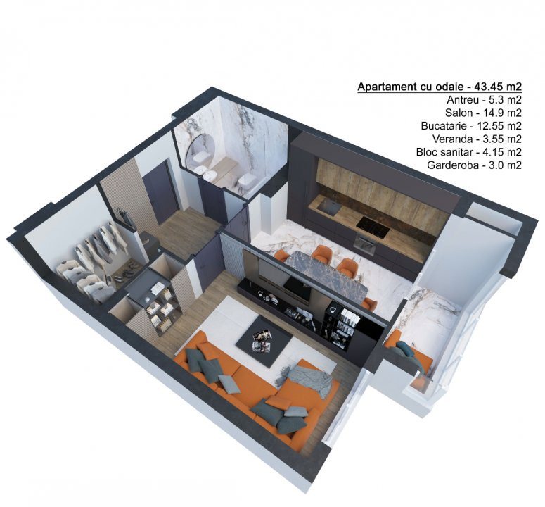 Locuința are suprafața de 43,90 m2. Etajul 5 din 10.