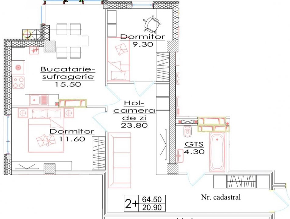 Compartimentare: 2 dormitoare, bucătărie, living, hol, living, bloc sanitar, antreu.