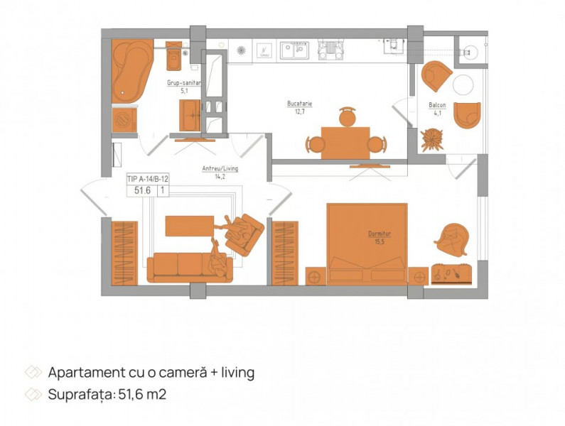 Compartimentare: dormitor, living, bloc sanitar, bucătărie, balcon.