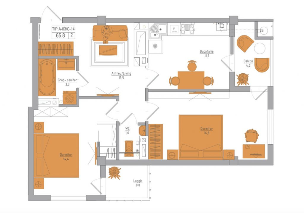 Suprafața totală: 65,8 mp (2 dormitoare, living, 2 blocuri sanitare, bucătărie, balcon)