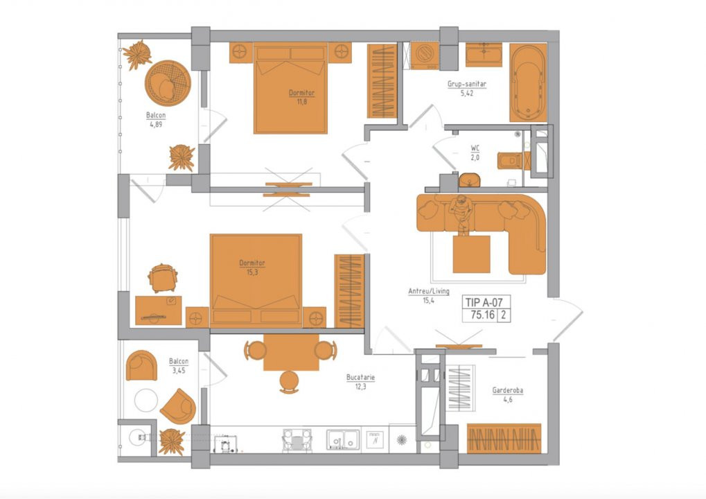 Suprafața totală: 75,2 mp (2 dormitoare, living, 2 blocuri sanitare, bucătărie, garderoba, 2 balcoane)