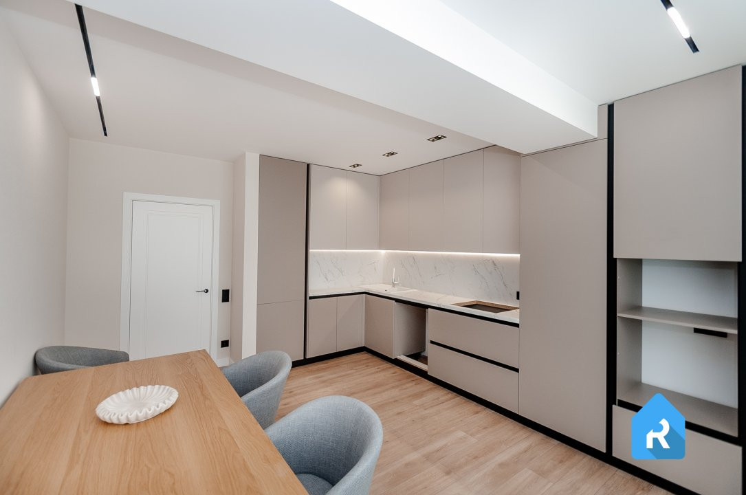 Bucătărie complet utilată, cu mobilier modern și electrocasnicele necesare