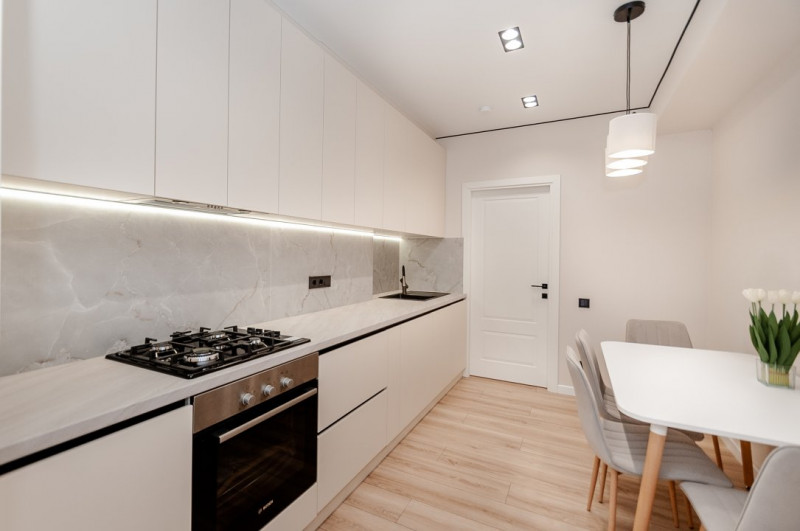 Bucătărie utilată: mobilă modernă, cu spațiu de lucru generos și toate electrocasnicele necesare;