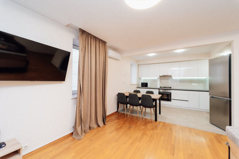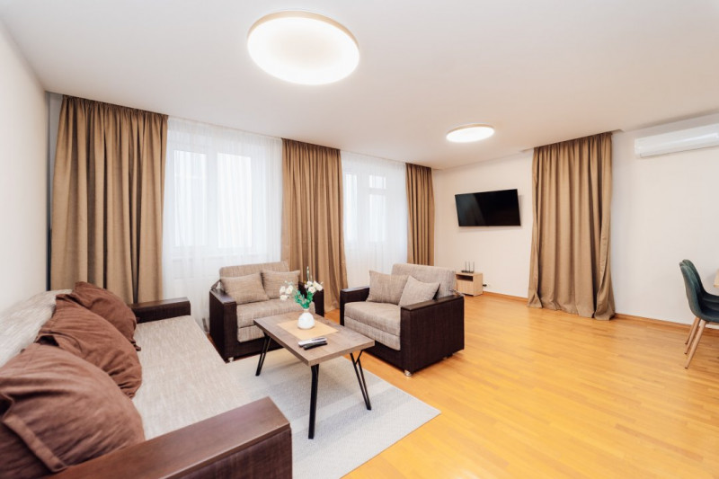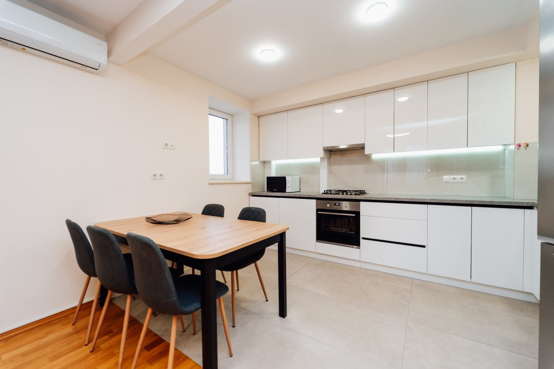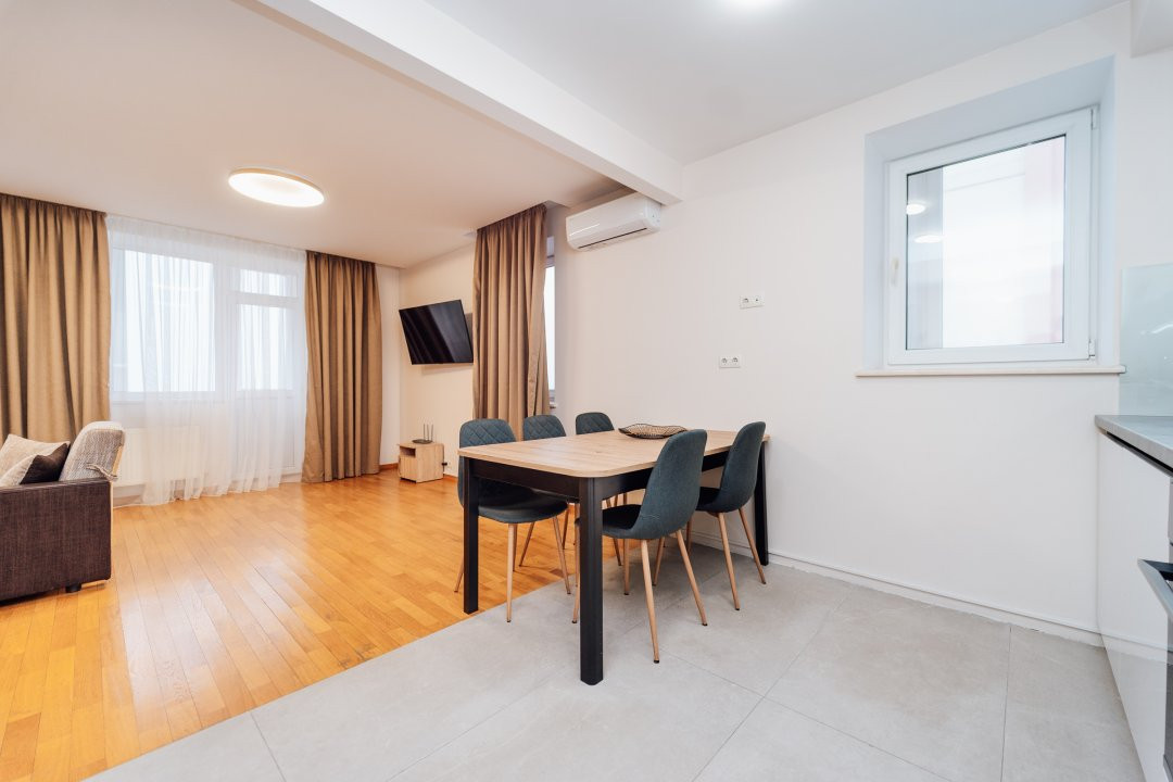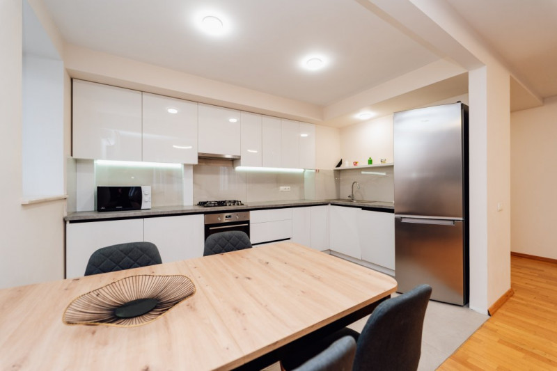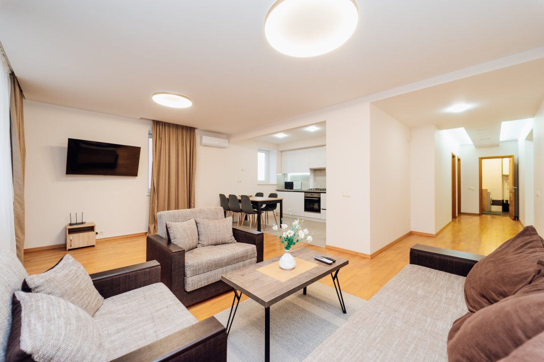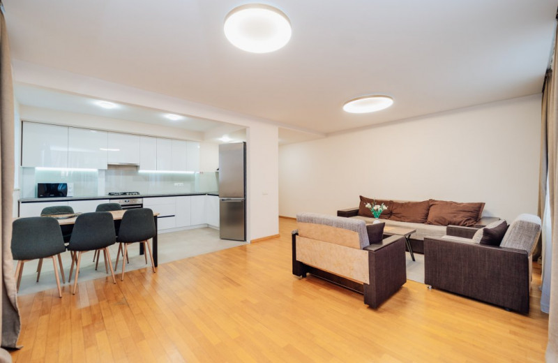 Living mare, unit cu bucătăria — un spațiu luminos și aerisit, perfect pentru relaxare și socializare.