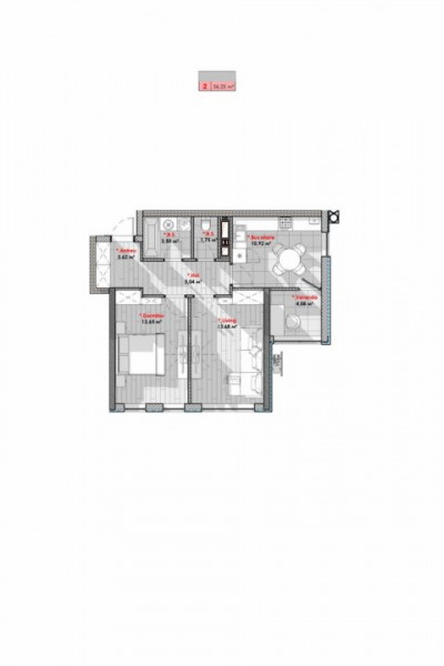 Apartamentul are suprafața 56,25 m2 și este compartimentat în: 2 camere, bucătărie,balcon, 2 blocuri sanitare și antreu.