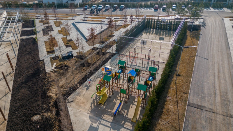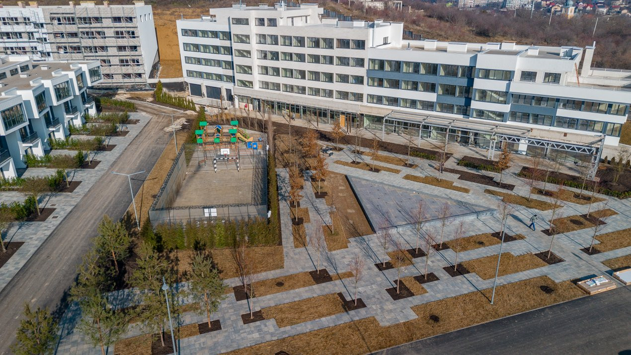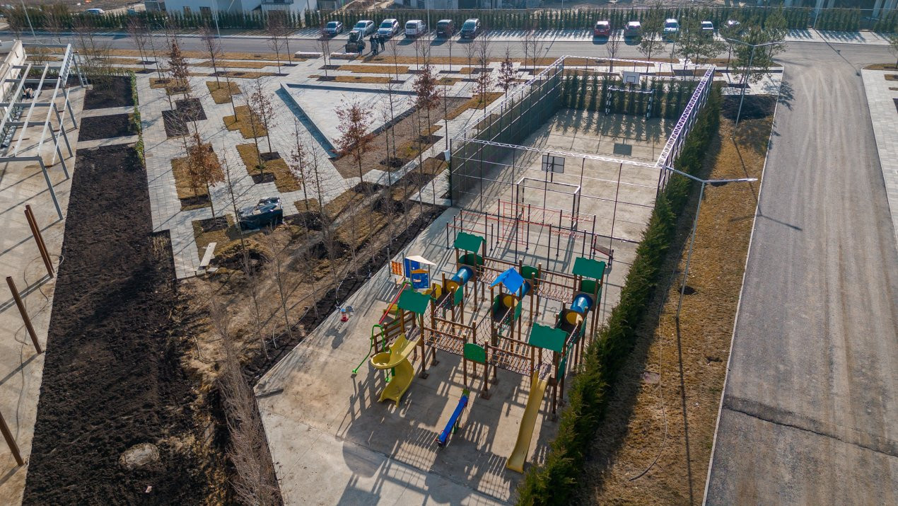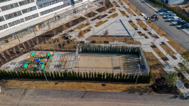 Curtea complexului va fi amenajată cu diverse spații comerciale, gradiniță privată, multiple terenuri de joacă pentru copii, terenuri de sport pentru maturi, iar în etapa I va fi amenajat propriul parc cu havuz și alee pietonală.