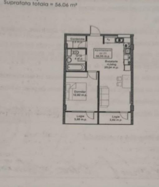 Compartimentare: dormitor, bucătăria comasată cu living, bloc sanitar, garderobă, balcon.