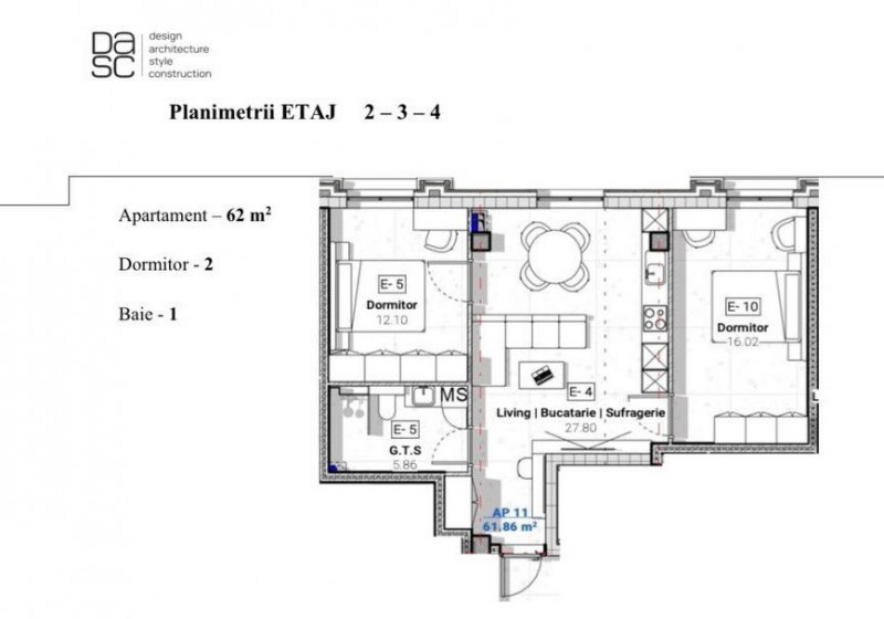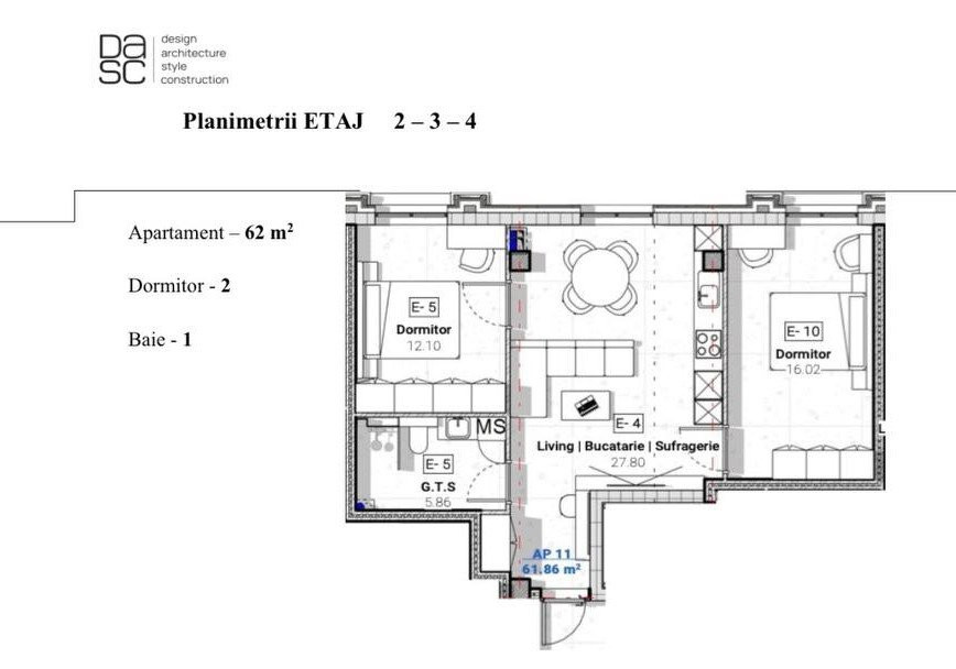 Apartamentul are o suprafață de 62 mp, este amplasat la etajul 2 din 4 și beneficiază de un nivel de finisaje și dotări de excepție, pregătit pentru a vă oferi tot confortul necesar: