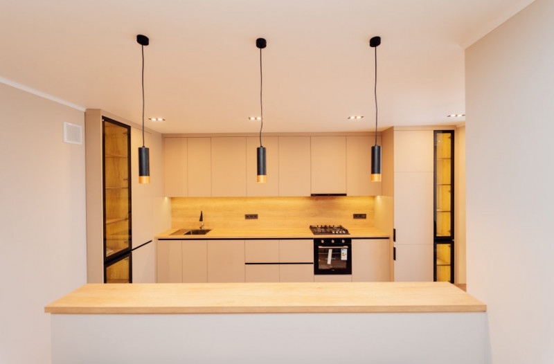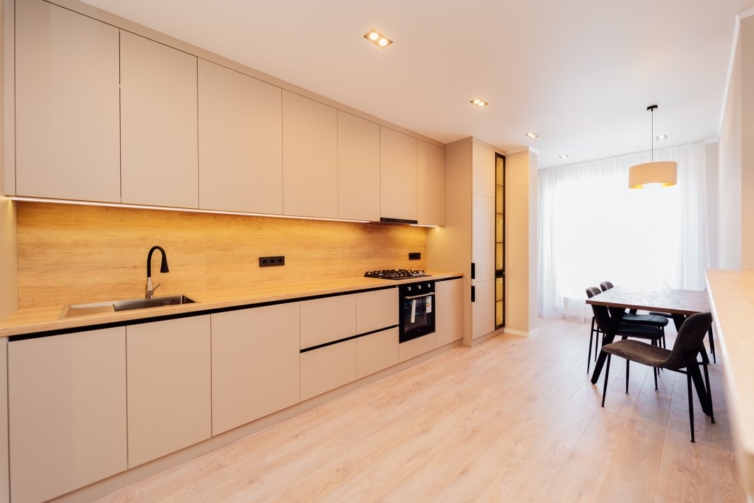 Bucătărie integrată cu zonă de luat masa;