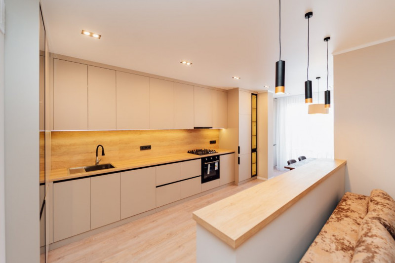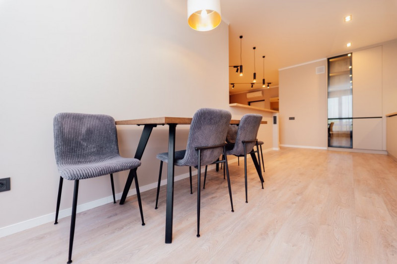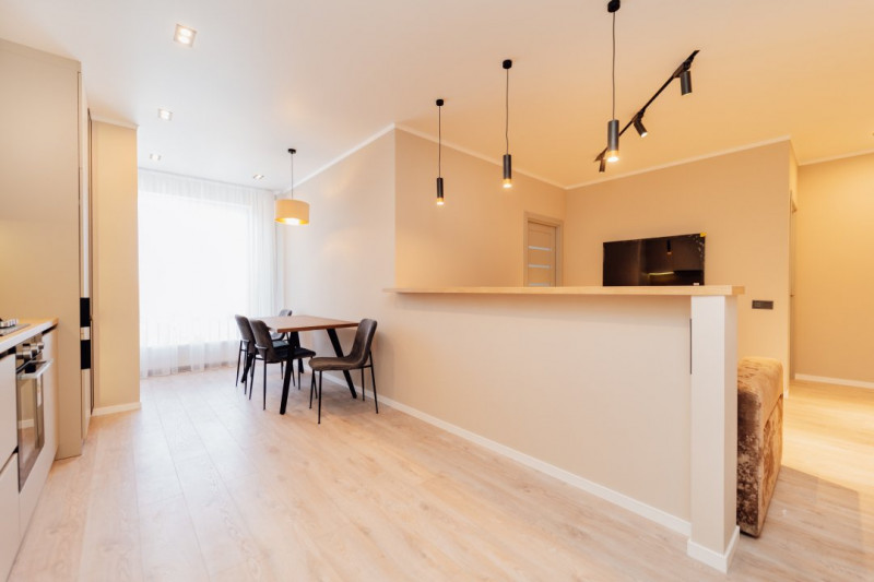 Livingul este completat de o masă de bar elegantă, ideală atât pentru cine rapide, cât și pentru momentele de socializare cu prietenii.