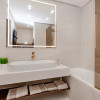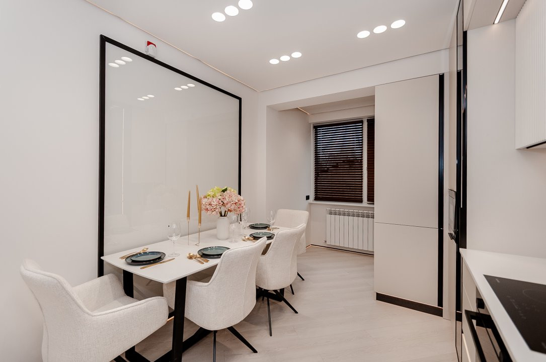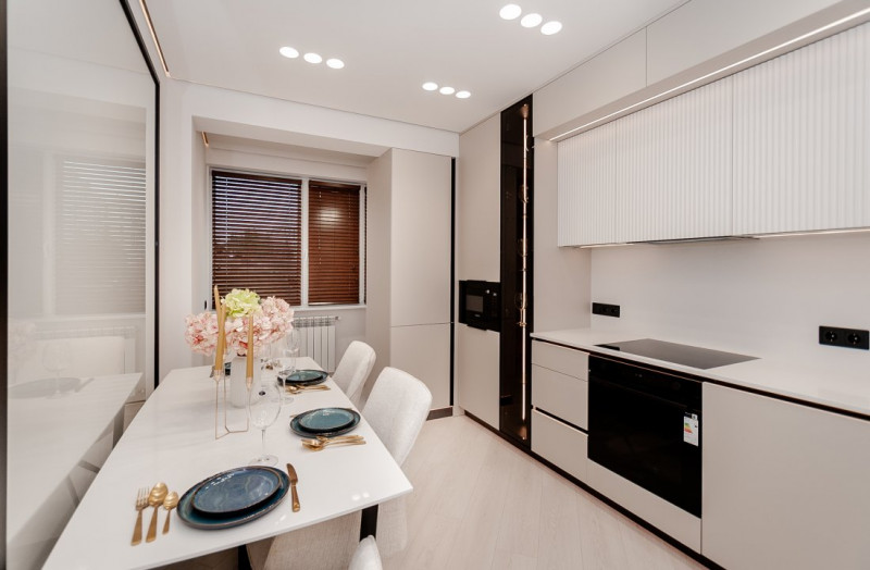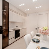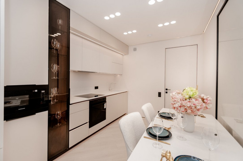 Bucătărie complet utilată, cu tehnică modernă și spațiu pentru gătit și servirea meselor;