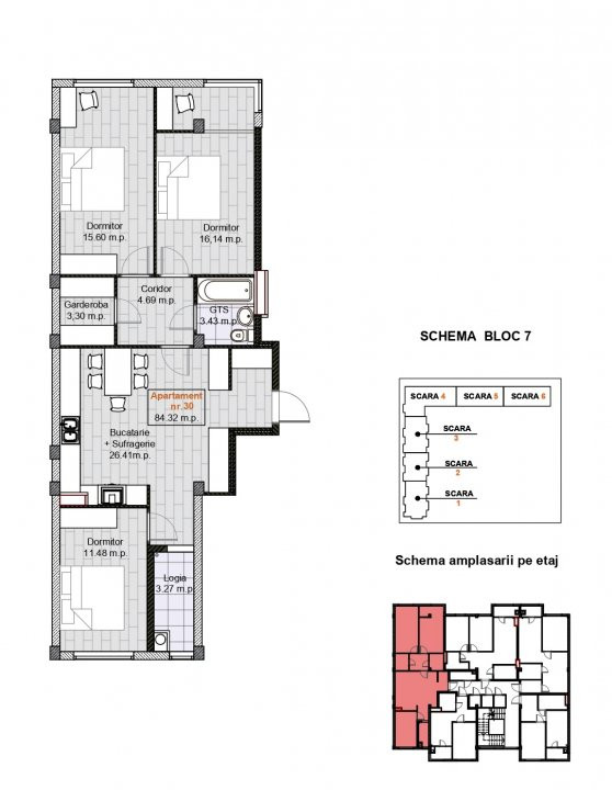 Grup sanitar - 3.43 m2; Bucatarie+Living - 26.41 m2; Dormitor 1 - 16.14m2; Dormitor 2 - 15.60m2; Dormitor 3 - 14.48 m2; Logia - 3.27; Garderoba 1 - 3.30 mp;