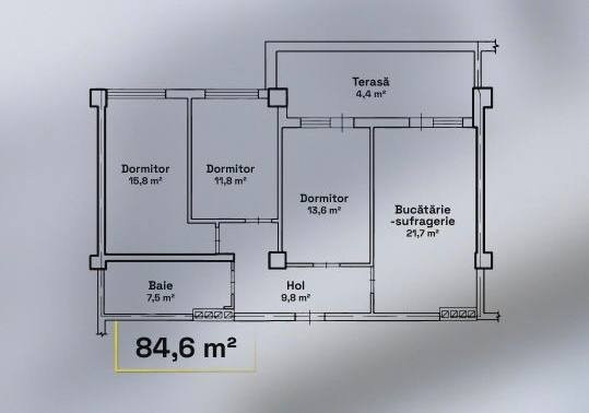 Penthouse în variantă albă, format din 3 dormitoare spațioase, un living generos integrat cu bucătăria și un bloc sanitar modern.
