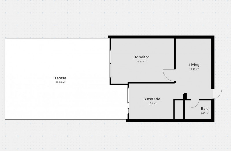 Apartamentul dispune de o terasa generoasă de 60 mp, un dormitor, living, bucătărie, antreu, bloc sanitar.