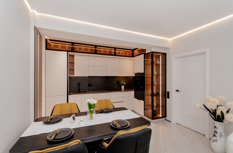 Bucătăria deschisă, integrată armonios cu zona de living, este ideală pentru momente de socializare sau relaxare.