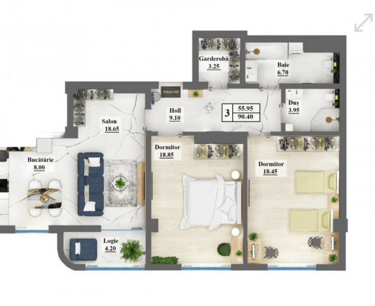 Compartimentare comodă: living spațios cu bucătărie, 2 dormitoare, 2 băi, balcon și garderobă.