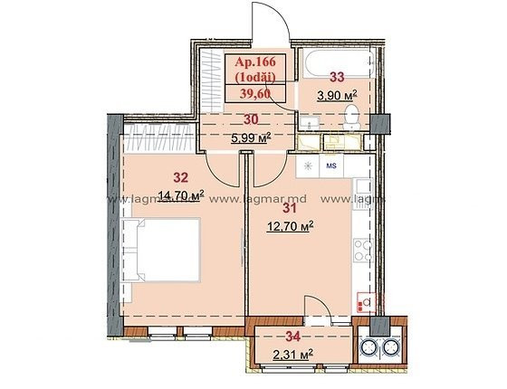 Compartimentare: 1 cameră, bucătărie, 1 bloc sanitar, balcon, antreu.