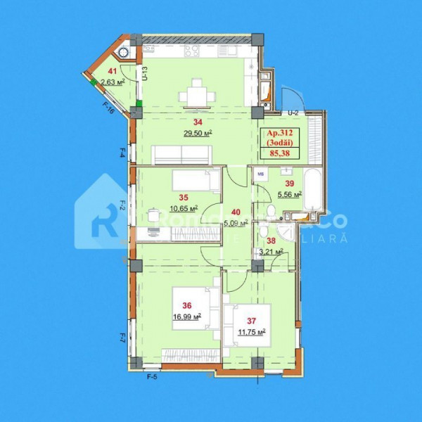 Compartimentare: 3 dormitoare, bucătăria + living, balcon, 2 blocuri sanitare și antreu.