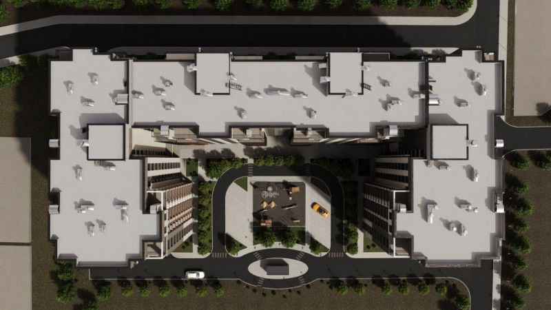 - Curtea amenajată cu elemente arhitecturale, bănci, locuri de recreere, copaci, gazon, arbuști, teren de joacă pentru copii.