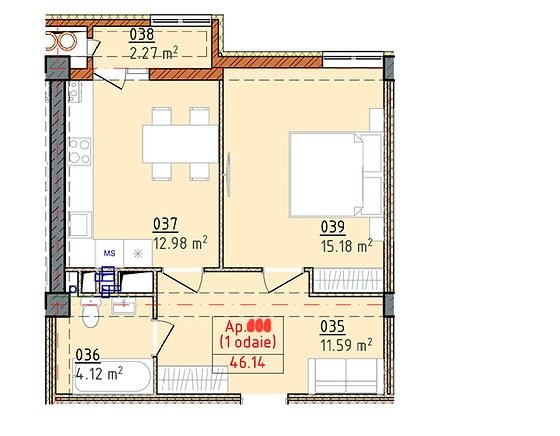 Apartamentul are suprafața 46,14 m2 și este compartimentat în: 1 cameră, bucătărie, living, 1 bloc sanitar, antreu și balcon.