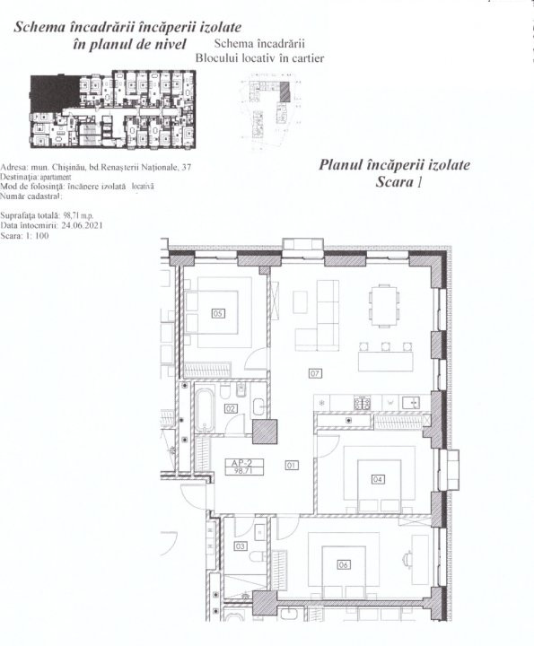 Compartimentare: antreu, bucătărie comasată cu living, 3 dormitoare, 2 blocuri sanitare.