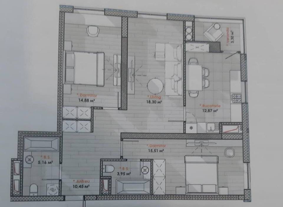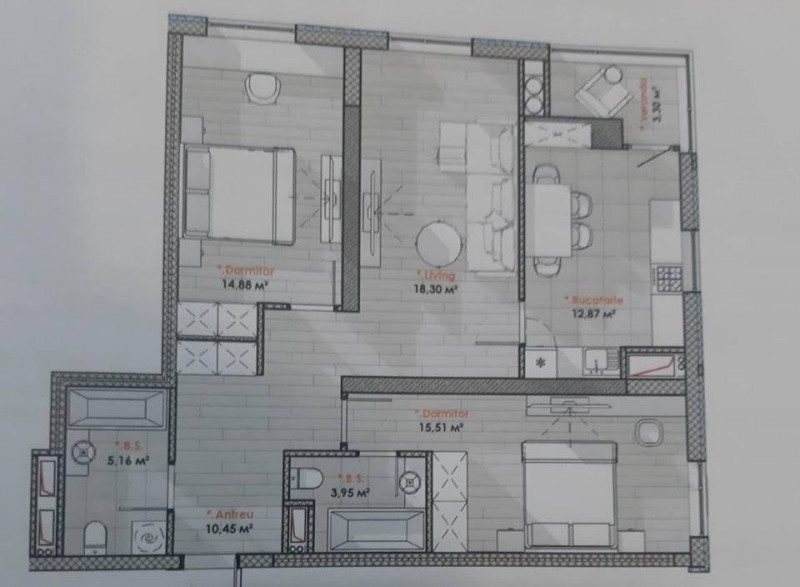 Compartimentare: 3 dormitoare, bucătărie, 2 blocuri sanitare.