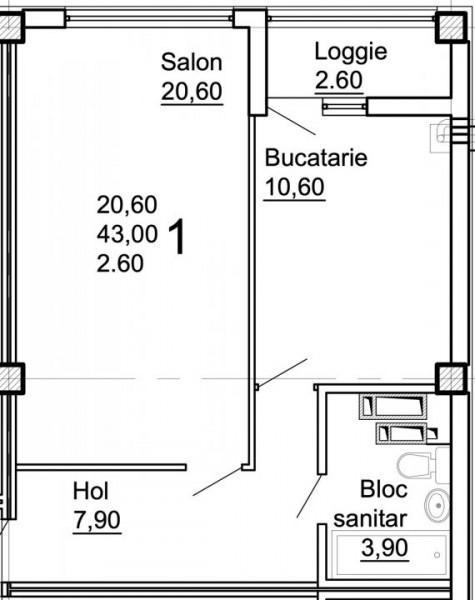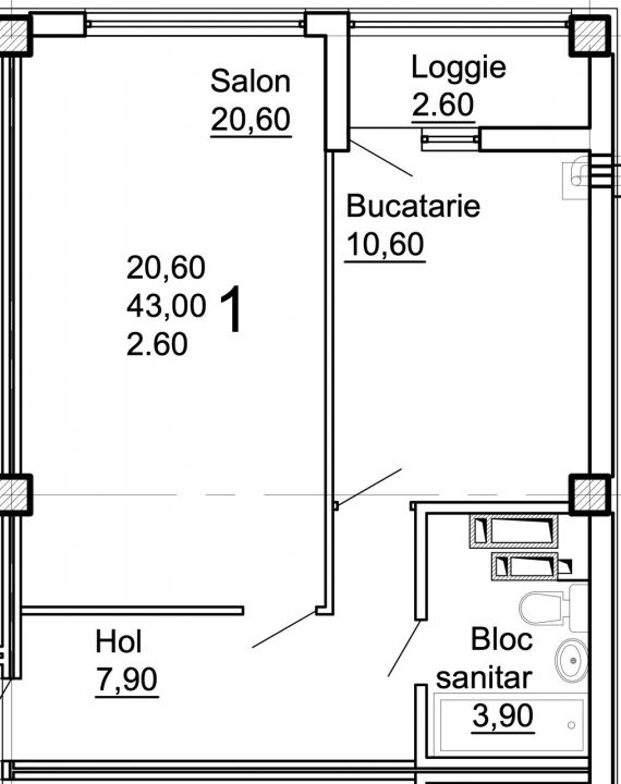 Apartamente cu o cameră, cu o suprafață de 45 mp.