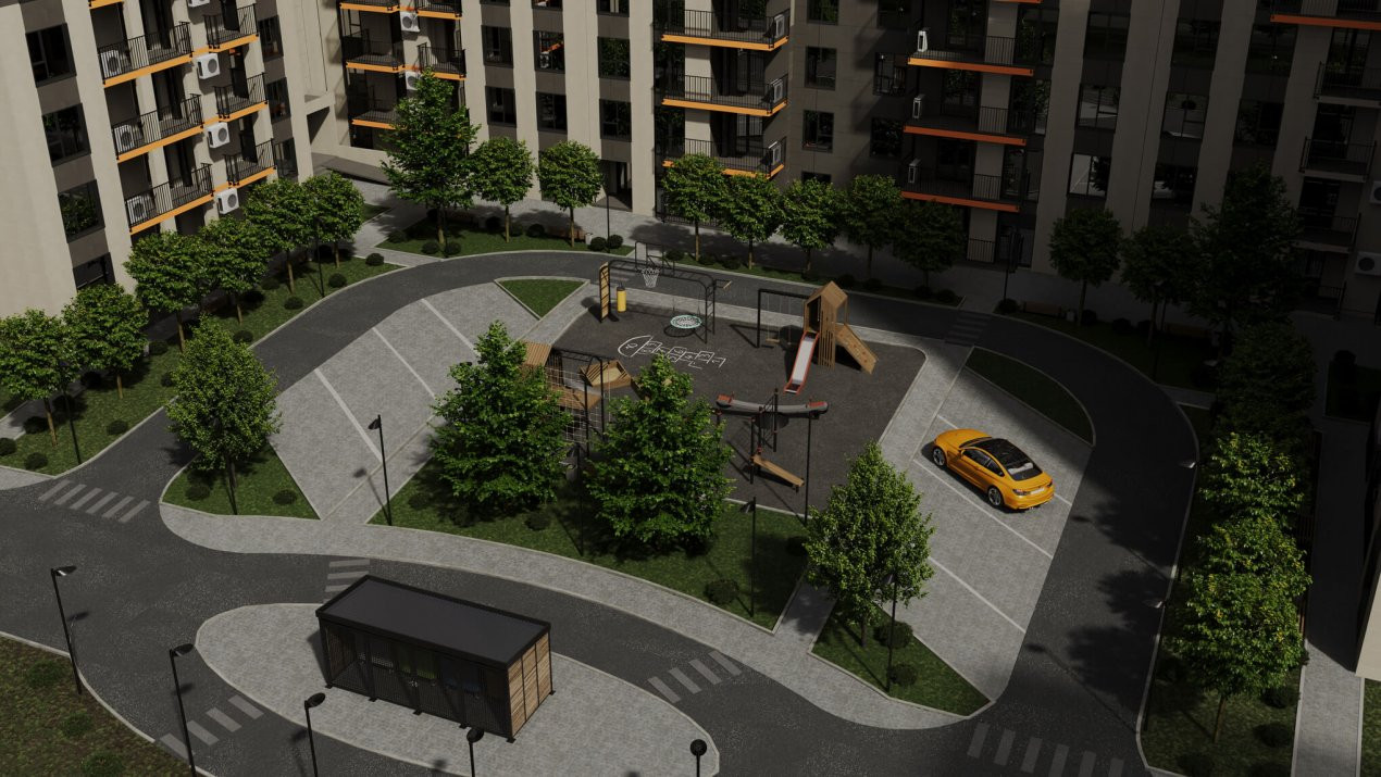 Zona adiacentă blocului va fi complet amenajată cu elemente arhitecturale moderne, bănci, spații verzi, locuri de recreere, copaci, gazon și arbuști — totul pentru confortul rezidenților.