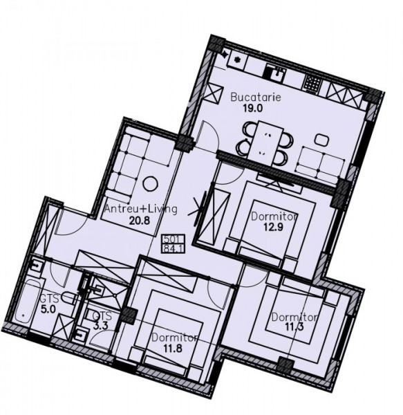 Apartamente cu 2 camere între 61,5 m² și 85,12 m²;