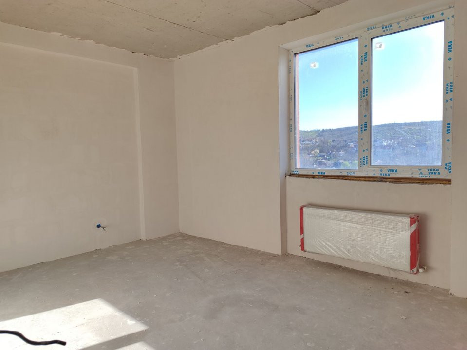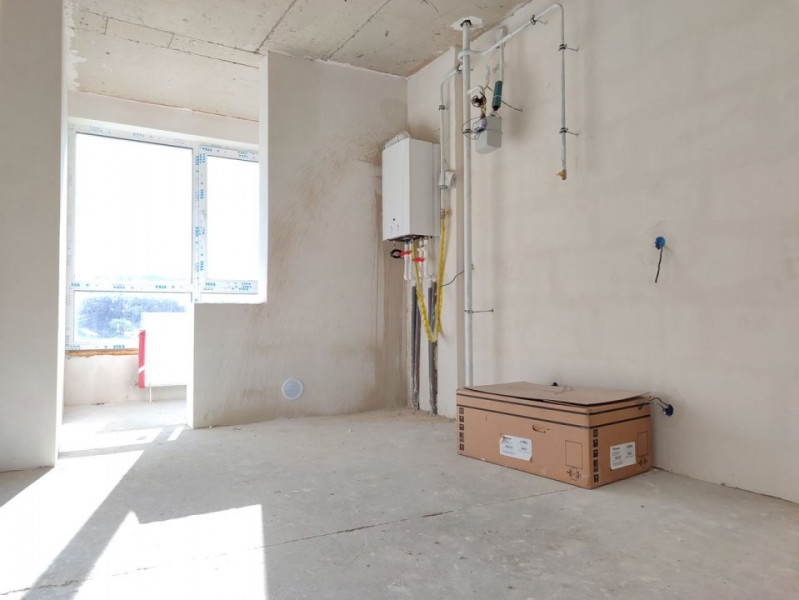 Apartamentul are o planificare eficientă, incluzând living și bucătărie spațioasă cu geamuri panoramice și un dormitor luminos.