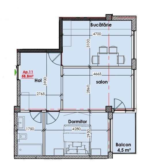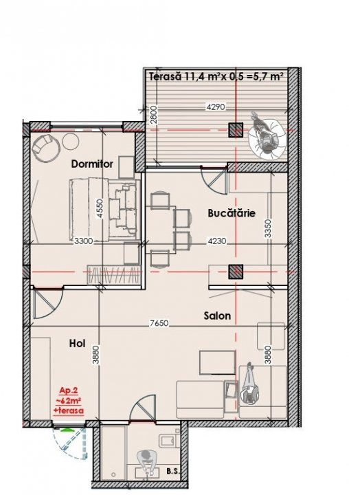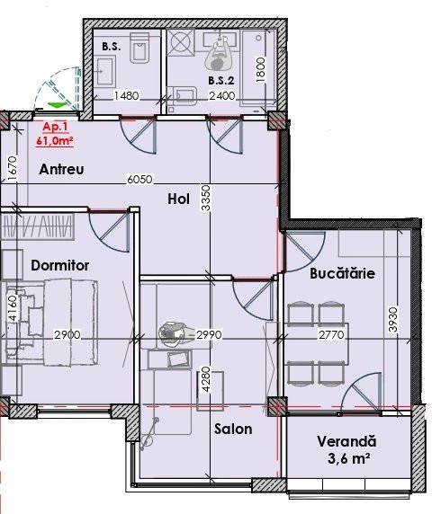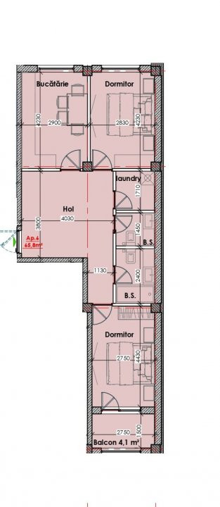 Apartamente cu 2 odăi de la 58 pâna la 65m2.