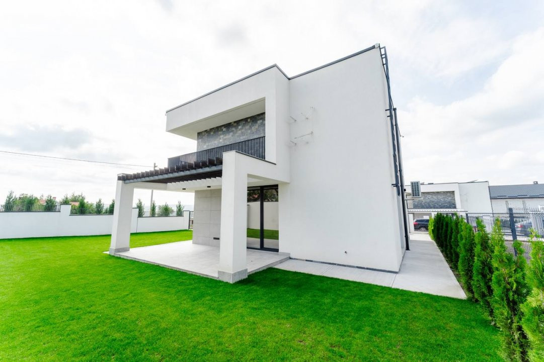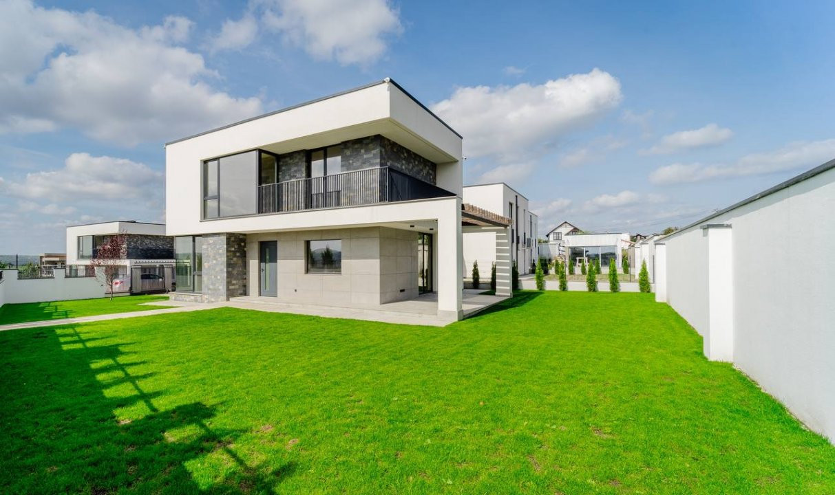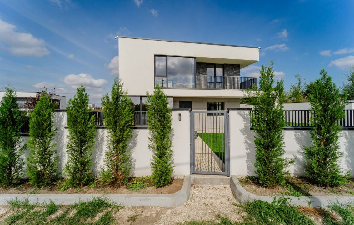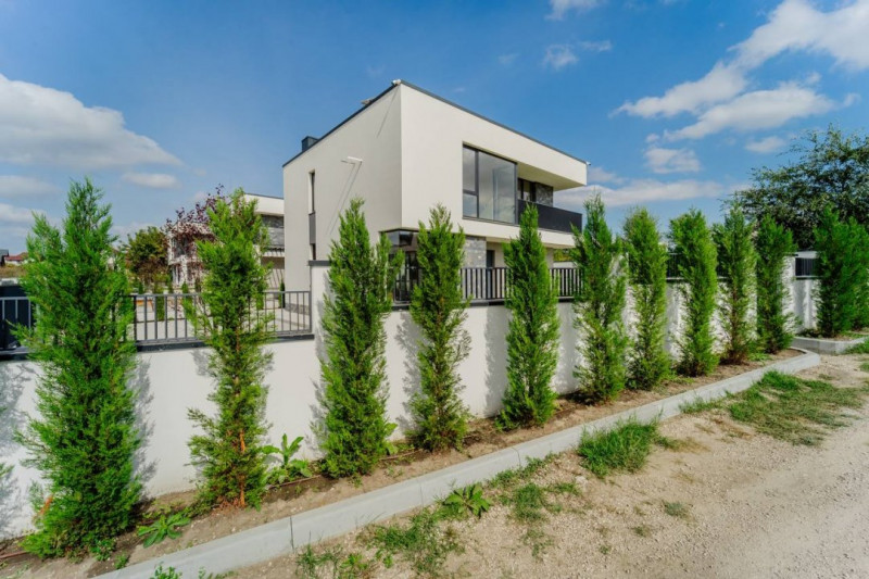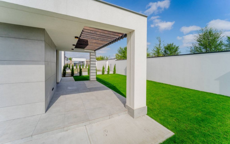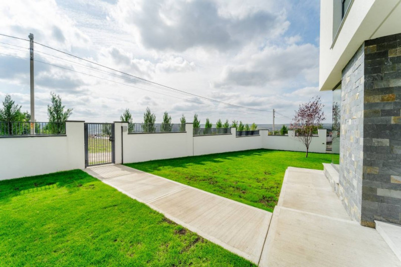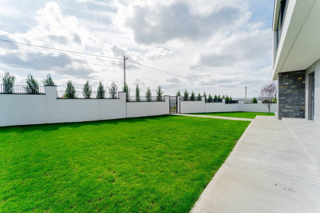 Ograda: Teren adiactent casă de 5 ari. Pereul executat din beton maturat + spații verzi dotate cu irigare, porți glisante pe orizontală;