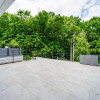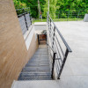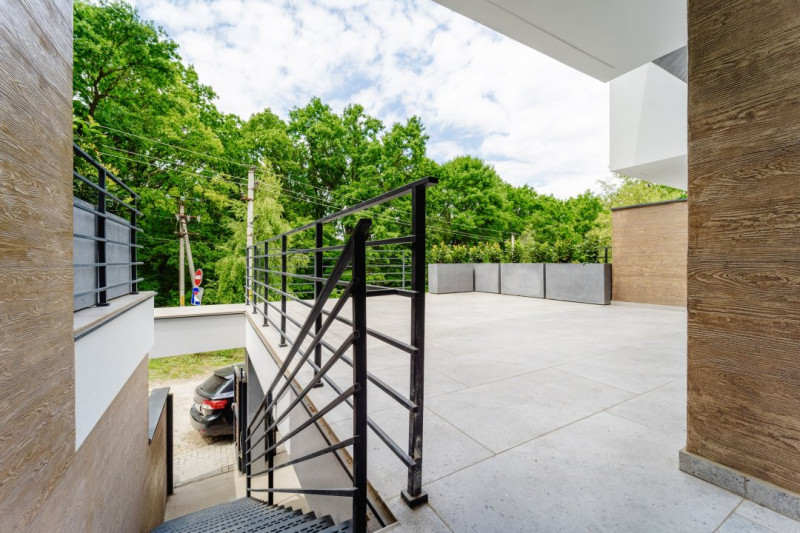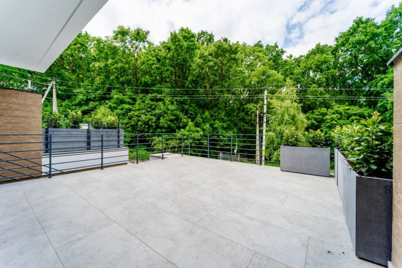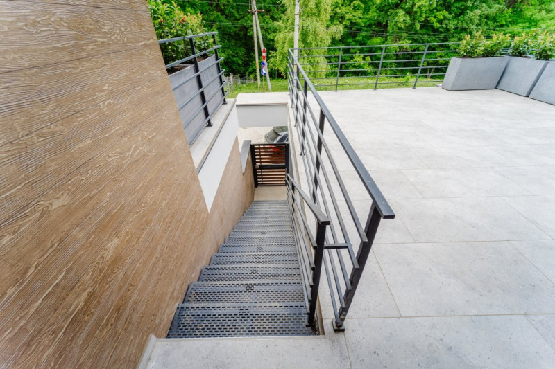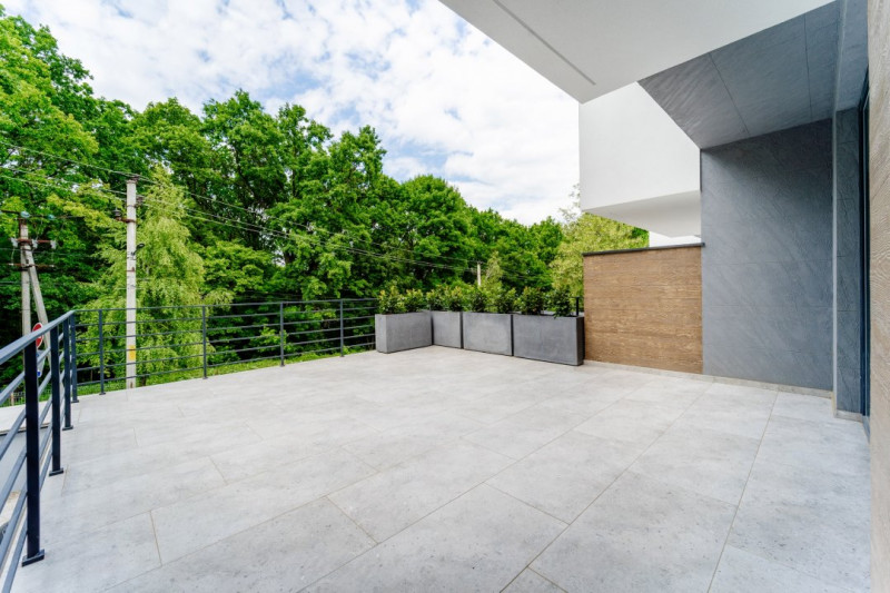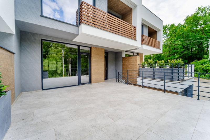 Pe primul nivel, avem un alt antreu, un alt bloc sanitar cu cazangerie, o bucătărie cu living, o terasă mică în spate pentru grătar și o terasă mare în față cu vedere spre pădure;