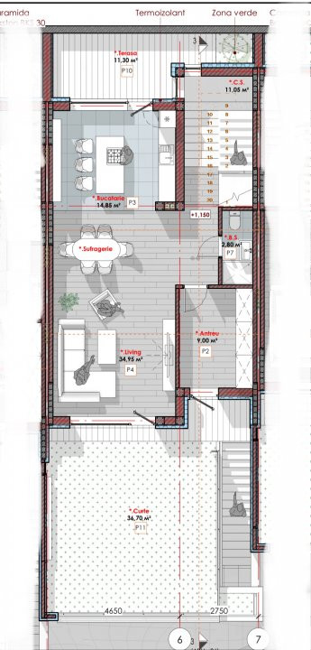 Proprietatea beneficiază de fonoizolare între townhouse-uri și tavane cu o înălțime de 3 metri.