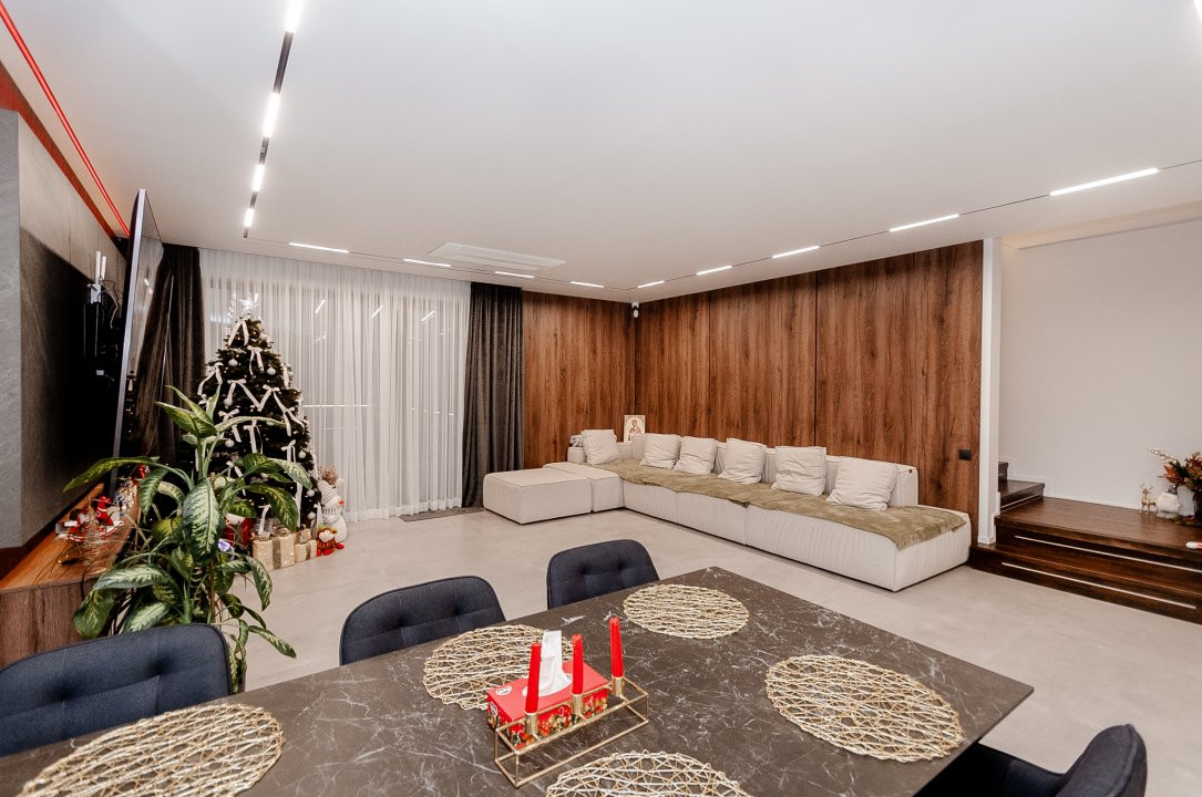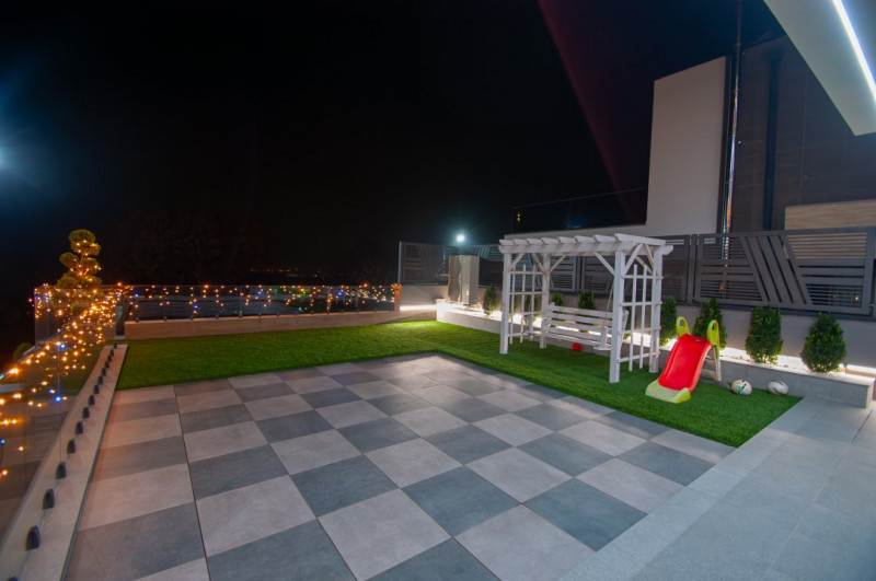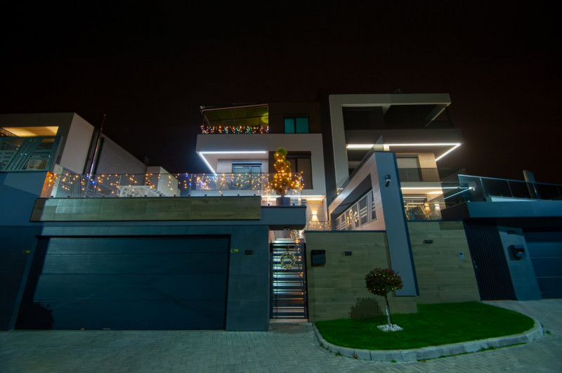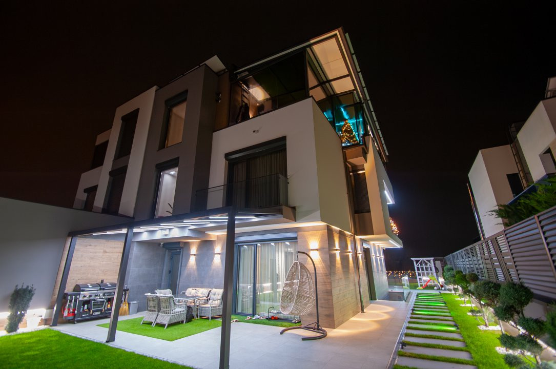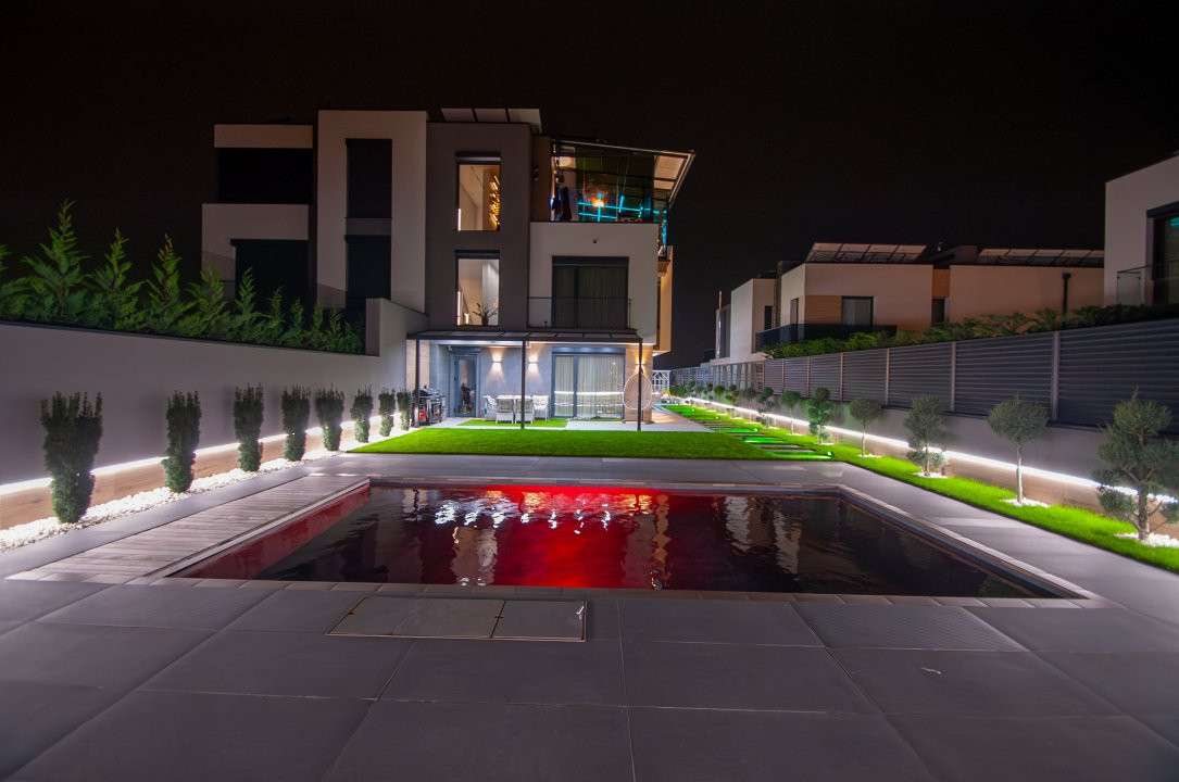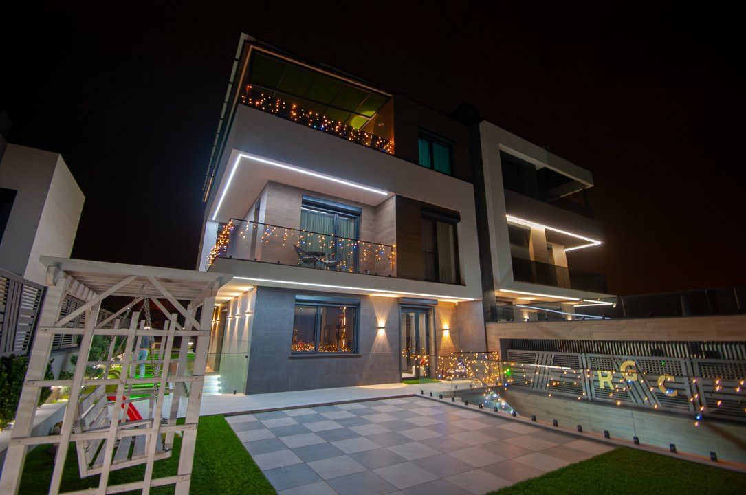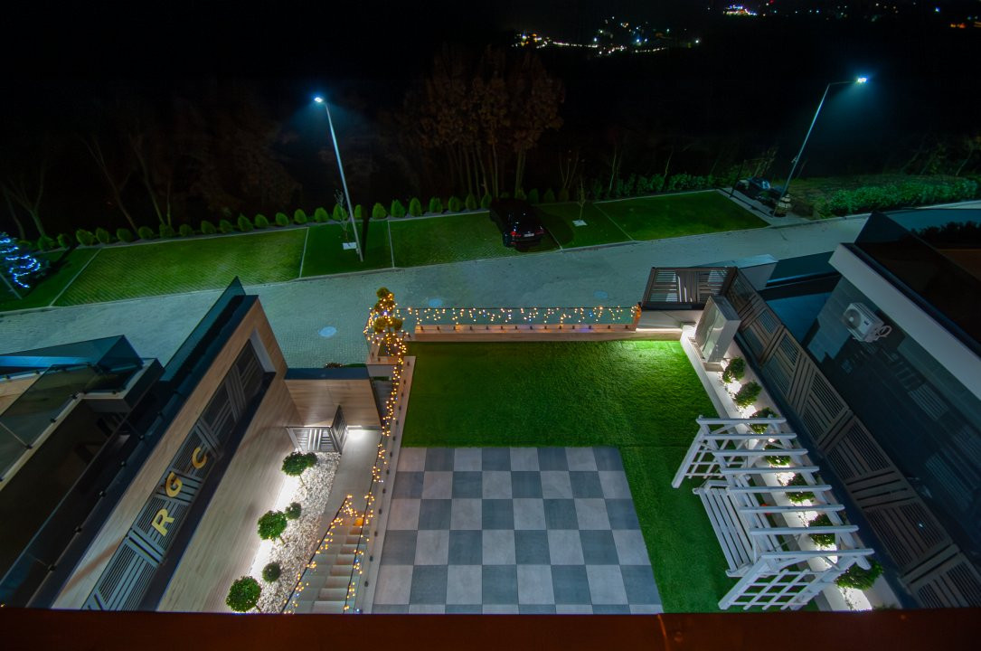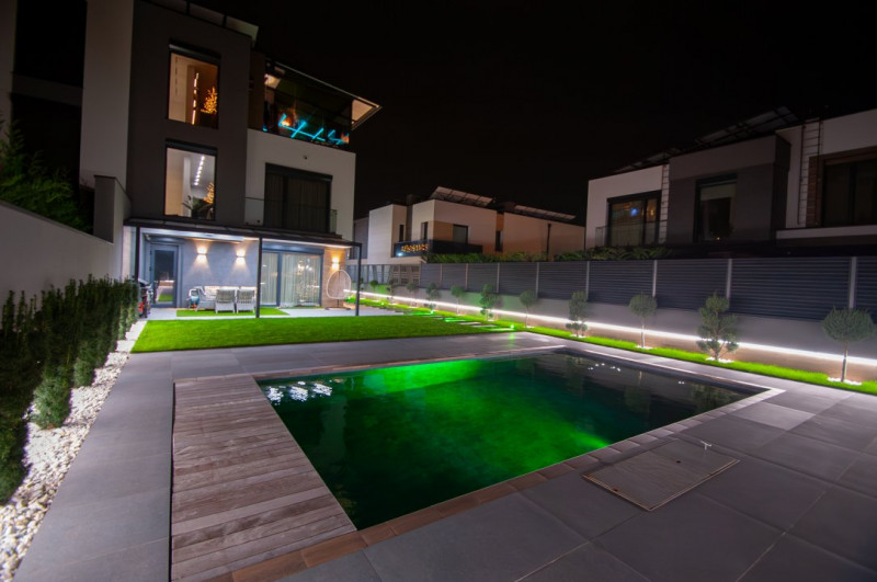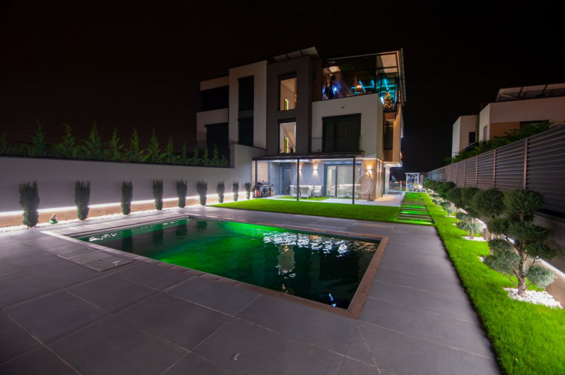 Exteriorul proprietății este la fel de impresionant, cu o curte frumos amenajată pe o suprafață de 6 ari, gazon și pomi decorativi, o terasă mare în fața casei, locuri de parcare pentru oaspeți și o piscină cu apă sărată și încălzire, perfectă pentru relaxare și divertisment. De asemenea, beneficiați de o zonă de barbecue și un ciubar din lemn pentru momente de relaxare în aer liber.