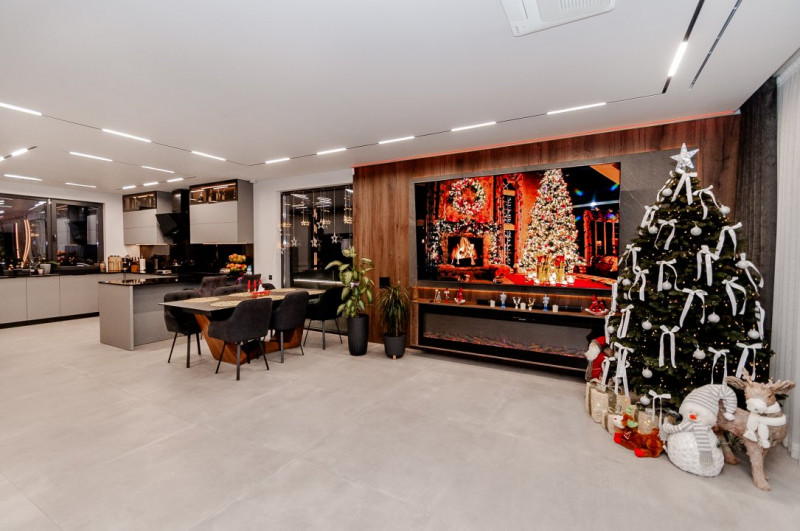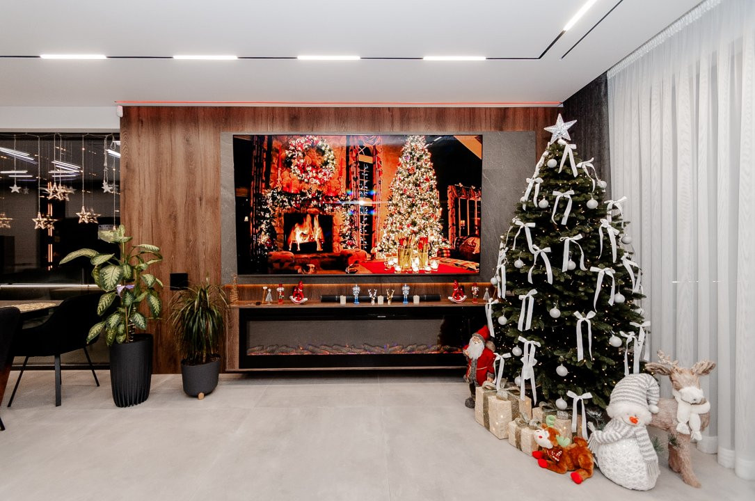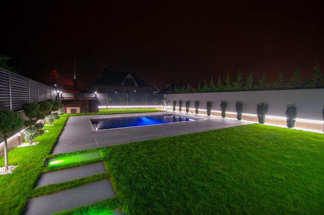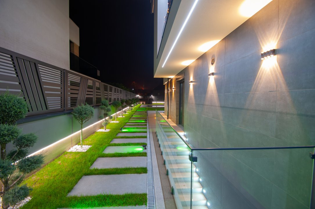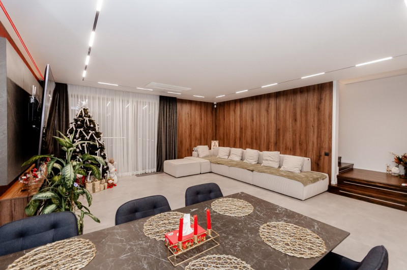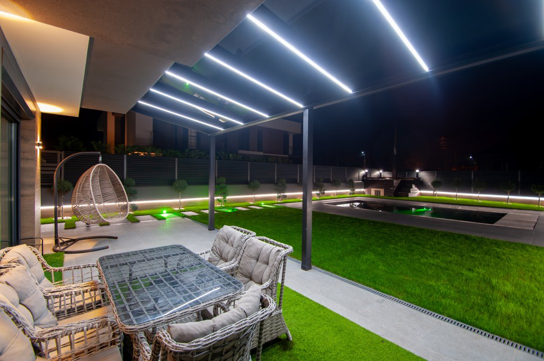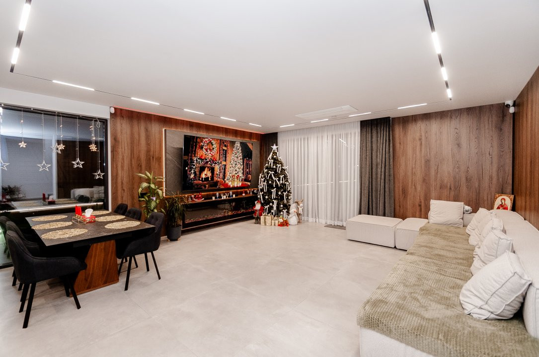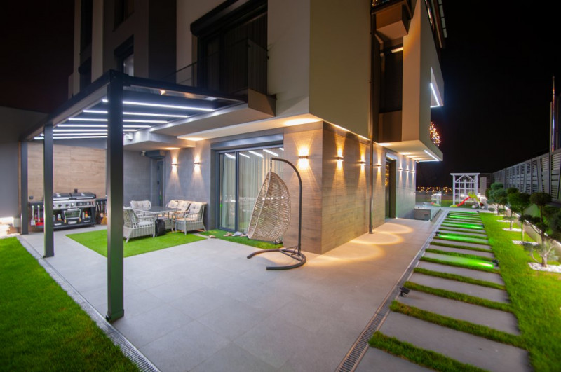 Exteriorul proprietății este la fel de impresionant, cu o curte frumos amenajată pe o suprafață de 6 ari, gazon și pomi decorativi, o terasă mare în fața casei, locuri de parcare pentru oaspeți și o piscină cu apă sărată și încălzire, perfectă pentru relaxare și divertisment. De asemenea, beneficiați de o zonă de barbecue și un ciubar din lemn pentru momente de relaxare în aer liber.