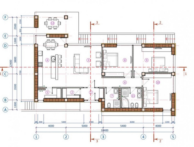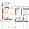 - Antreu, bloc sanitar, bucătărie, living comasat cu bucătătrie, cazangerie, beci, încăpere tehnică, 3 dormitoare separate cu geamuri panoramice;